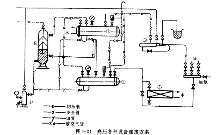 圖9-21是高壓各種設(shè)備如冷凝器、貯液桶、分油器、空氣分離器等以及集油器、加氨站的管道連接方案。