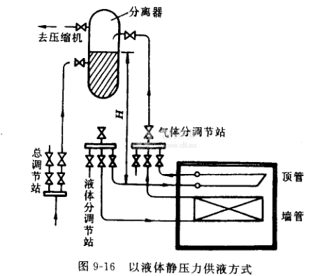 (2)重力式供液系統(圖9-16)圖中氨液分離器是不盡完善的,因為氨液面對供液及減少壓縮機的濕沖程和液擊是十分重要的,因此最好在氨液分離器上加裝低壓浮球控制液面以及在液面處增設滋液管,把多于的液體導入低壓貯液容器內。