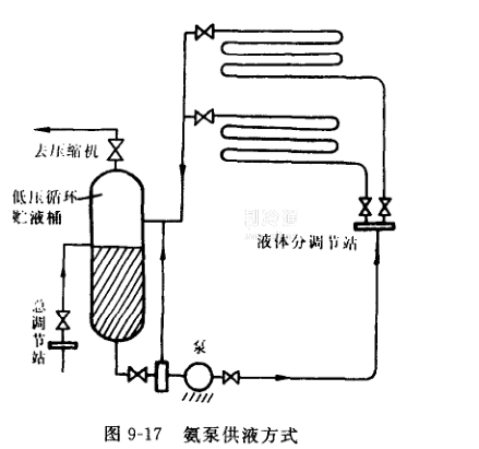(3)氨泵供液方式(圖9-17)蒸發器、管道、氨泵及低壓循環桶構成了低壓蒸發系統。高壓液體在進入低壓循環桶時就被節流為蒸發壓力。