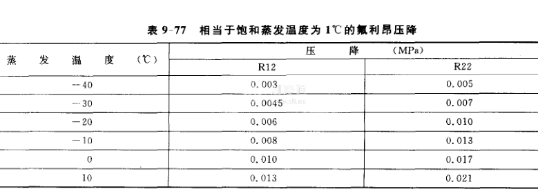 關于相當飽和蒸發(fā)溫度為1℃的氟利昂壓力降見表9-77。