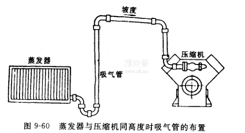 (3)蒸發(fā)器布置在壓縮機上面時,應在蒸發(fā)器上側設置倒U型管,如圖9-61所示,以防開車時液體進入壓縮機而引起液擊。但對全封閉式、半封閉式壓縮機來說,當液體進入壓縮機內,先經吸氣腔予以汽化過熱,再進入汽缸,若不設倒U形管,問題也不大。