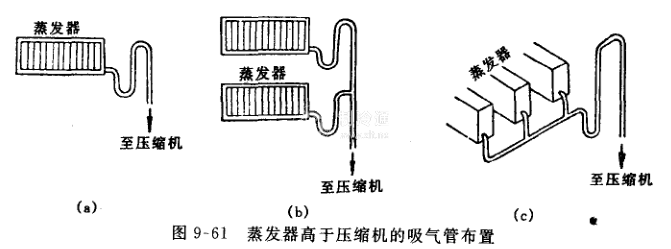 (4)當蒸發(fā)器布置在壓縮機下面時,為了改善回油,應每隔10m左右設置一個集油彎,如圖9-62所示。在壓縮機吸入口附近的吸氣管上不要設置集油彎,以防止啟動時滑油沖缸事故,如圖9-63所示。