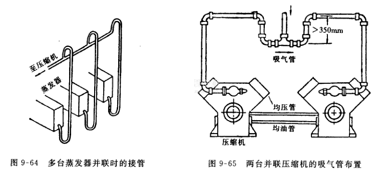 (6)當多臺蒸發(fā)器并聯(lián)時,為了不因某一臺或某幾臺蒸發(fā)器的負荷變化或停止運行時影響其他蒸發(fā)器的正常工作。可采用如圖9-64所示接法。