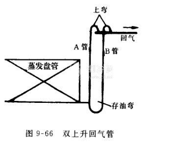 (7)雙上升回氣立管,雙上升立管見圖9-66所示,雙立管是為適應制冷負荷變化較大的系統(tǒng)而安設的,特別對于能進行能量調節(jié)的制冷系統(tǒng)更需按此方式安設。對于單立管是不能滿足制冷負荷變化較大的系統(tǒng)的,因為如按全負荷選管徑,當?shù)拓摵蓵r由于流速太低就無法回油了。如按低負荷選管徑時,當高負荷時回氣管壓降就太大了。而雙立管形式則解決了這個矛盾,其配管原則及工作原理是:雙立管中A管為細管,按最低負荷選管徑AB管的截面積之和應能滿足全負荷時的要求,壓力降既不可過大,并又能使回油速度在規(guī)定范圍之內。按此原則決定B管直徑;低負荷工作作時,開頭是雙管都工作,但因流速低,不能把油帶走,油流入存油彎內,并形成油束堵住B管,只有A管工作,管內流速增高,使低負荷回油得到保證;當轉人全負荷工作時,開始是由于只A管工作流速很高,接著B管也逐漸有氣體流過把存油彎的油帶走,使B管通暢,以致AB管同時投入工作。存油彎的設計不可過大,如存油太多要影響曲軸箱的油量,也會使消除存油的時間太長和瞬時回油太多,這些是很不利的。④為防止低負荷工作時由A管上升的油又滑人B管內,故在兩立管與水平管連接處都做一個向上的彎頭。