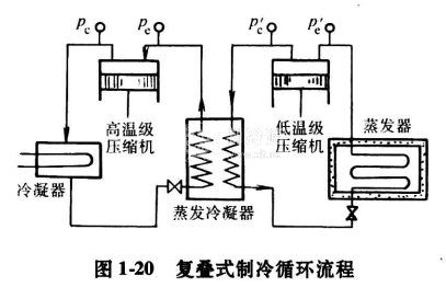 復(fù)疊式蒸汽壓縮制冷循環(huán)是由兩個(gè)或兩個(gè)以上的單級(jí)壓縮制冷循環(huán)組成,在每個(gè)單級(jí)制冷系統(tǒng)中充加不同性質(zhì)的制冷劑。它既能滿足在較低溫度時(shí),有合適的蒸發(fā)壓力,又能滿足在環(huán)境溫度條件下冷凝時(shí),具有合適的冷凝壓力。