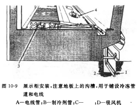展示柜中溫度稍高,用于存放新鮮肉類或奶制品,不存在特殊蒸發(fā)器問題。蒸發(fā)器使用吹風(fēng)式,冷風(fēng)從柜背部風(fēng)管吹出,經(jīng)散流柵板,氣流與冷卻食品等高,剛好使食品能更好地冷卻。見圖10-9,熱空氣從柜前面被吸走。