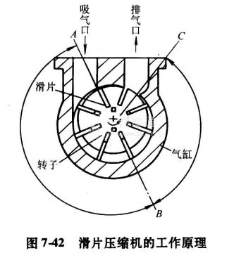 隨轉(zhuǎn)子的旋轉(zhuǎn),滑片由A逆時(shí)鐘方向運(yùn)動(dòng),使之與其后滑片及氣缸壁所圍成的小室容積不斷擴(kuò)大,氣體被吸人小室內(nèi)。當(dāng)滑片轉(zhuǎn)到B點(diǎn)時(shí),小室容積達(dá)到最大值,并與吸氣口隔開,吸氣結(jié)束,此時(shí)小室的容積即為吸氣容積,由A到B即為吸氣過程。當(dāng)轉(zhuǎn)子繼續(xù)轉(zhuǎn)動(dòng),小室容積不斷縮小,其內(nèi)氣體壓力不斷升高,直至滑片頂端到達(dá)C位置。當(dāng)滑片回到A點(diǎn)時(shí),排氣結(jié)束,小室容積達(dá)到最小值。轉(zhuǎn)子繼續(xù)旋轉(zhuǎn),小室容積又開始增大,待殘留在該最小容積中的高壓氣體膨脹降版后,又開始吸氣。如果滑片數(shù)為z片,則轉(zhuǎn)子每旋轉(zhuǎn)一周,依次有z個(gè)小室分別進(jìn)行吸氣一壓縮一排氣一膨脹過程。