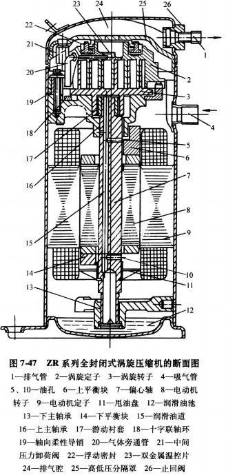 圖7-47為ZR系列全封閉式禍旋壓縮機的斷面圖,其工作原理如下:從蒸發器過來的工質氣體經吸氣管 4進入壓縮機機殼,通過處于機殼上部的渦旋轉子3和渦旋定子壓縮,由渦旋定子中心孔排出,并經由高低壓分隔罩25進入頂部排氣腔24。在分隔罩與渦旋定子間設有密封面。在機殼體排氣管1處裝有止回閥26。在渦旋定子的中心排氣孔口附近,設有一旁通管20,通道口由雙金屬溫控片23控制。當排氣溫度過高時,溫控片打開通道口,使高低壓旁通,排氣腔壓力降低,止回閥關閉,壓縮機運轉在卸載狀態,避免壓縮機過熱。用這種方式,壓縮機排氣溫度可控制在150℃以下,從而避免壓縮機的權壞。偏心軸7對渦旋轉子的傳動,通過十字聯軸環18相連,使渦旋轉子僅能繞渦旋定子公轉,防止了禍旋轉子的自轉。渦旋轉子盤與偏心銷之間裝有游動襯套170壓縮機的潤滑是借助于偏心軸運轉時的離心抽力,將殼體下部油他中的潤滑油,沿著偏心軸中的油道,送到主軸承、偏心銷、游動襯套進行潤滑。內置電動機處于機殼的下部,其定子緊配在機殼上,使機殼成為電動機的散熱面。在電動機轉子的上下端,設有上平衡塊6和下平衡塊14,以平衡渦旋轉子所產生的慣性力矩。