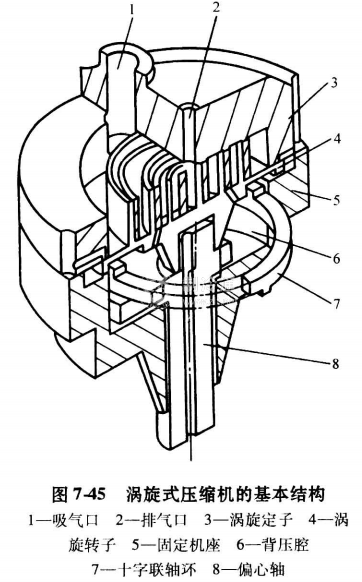 圖7-45已清楚地表示了渦旋壓縮機中壓縮部分的結構,它只有很少的5個主要零件:兩個渦旋體、機座、十字聯軸環和偏心軸。