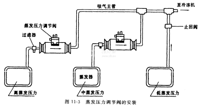 蒸發壓力調節閥用在一機多庫的制冷系統中,它被安裝在各冷卻系統的蒸發器的出口管道上,如圖11-3所示,利用調節閥的入口壓力來控制閥口開度,使各冷藏庫在各自不同的蒸發壓力下獲得不同的庫溫,又有一個相同的制冷機吸氣壓力。為了防止高蒸發壓力制冷劑蒸氣倒流入低蒸發壓力的蒸發器中一般在低蒸發器的出日處要加裝止回閥。