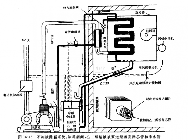 它有一個(gè)貯存不凍液(鹽水或乙二醉溶液)的容器.來(lái)自壓縮機(jī)排氣在進(jìn)入冷凝器之前,先進(jìn)入該容器加熱不凍液。容器中的不凍液也可在制冷循環(huán)時(shí)進(jìn)行電加熱。當(dāng)制冷循環(huán)停止時(shí)除霜定時(shí)器關(guān)閉從液管到蒸發(fā)器管路上的電磁閥,這時(shí)除霜循環(huán)開(kāi)始,蒸發(fā)器風(fēng)機(jī)停轉(zhuǎn),除霜不凍液沿著排水管、泄水盤(pán)和自己的管路(與蒸發(fā)器管組合成熱交換器)經(jīng)過(guò)蒸發(fā)器,加熱蒸發(fā)器盤(pán)管除霜,然后返回不凍液容器。圖10-46為利用乙二醇溶液進(jìn)行除箱的制冷系統(tǒng)。