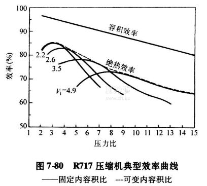 圖7-79和圖7-80示出所有單螺桿壓縮機的典型效率曲線。圖中Vi是壓縮機的內容積比,它決定于壓縮機的設計。和雙螺桿壓縮機一樣,單螺桿壓縮機有固定的內容積比,它等于在起動時的齒格容積和該齒槽和排出孔相連時的容積之比。近代設計的用于制冷的單螺桿壓縮機,都裝有在壓縮機運行時可變容積比的裝置。它是一簡單滑閥,可超前或延遲排氣孔口位置。