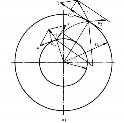 離心壓縮機的壓縮過程可按圖7-81予以說明。自蒸發器蒸發的制冷劑氣體,被單級葉輪吸入,通過葉輪、擴壓器、蝸殼等零件,壓力升高后送入冷凝器。制冷劑氣體進入葉輪后,如圖7-81a那樣由徑向流入葉輪的葉片。可通過從葉輪進口圓周速度u1,和進入氣體的絕對速度的矢量差,求得葉輪入口的相對速度w1。在葉輪出[11.亦可通過圓周速度u2和氣體出口絕對速度c2之矢量差求得葉輪出口的相對速度w2。圖7-81b示出進出口速度三角形。氣流是沿著葉片進行的,β1角是葉片進口角,β2角是葉片出門角度。制冷劑氣體以絕對速度c2和角α2進入擴壓器,葉輪出口的高速動能通過擴壓器和蝸殼,轉變為壓力能。