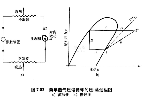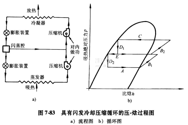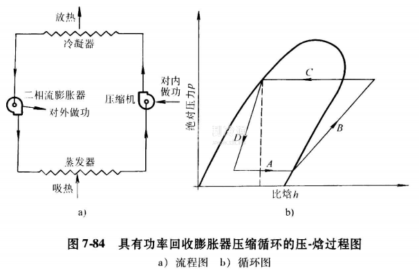 最新開發的一種帶膨脹器的蒸汽壓縮循環,該膨脹器是一種功率回收的二相流動透平。由于在膨脹過程降低了二相狀態制冷劑的比焓,從而提高了循環的制冷效應。圖7-82一圖7-84分別表示三種循環的壓-焓過程圖。