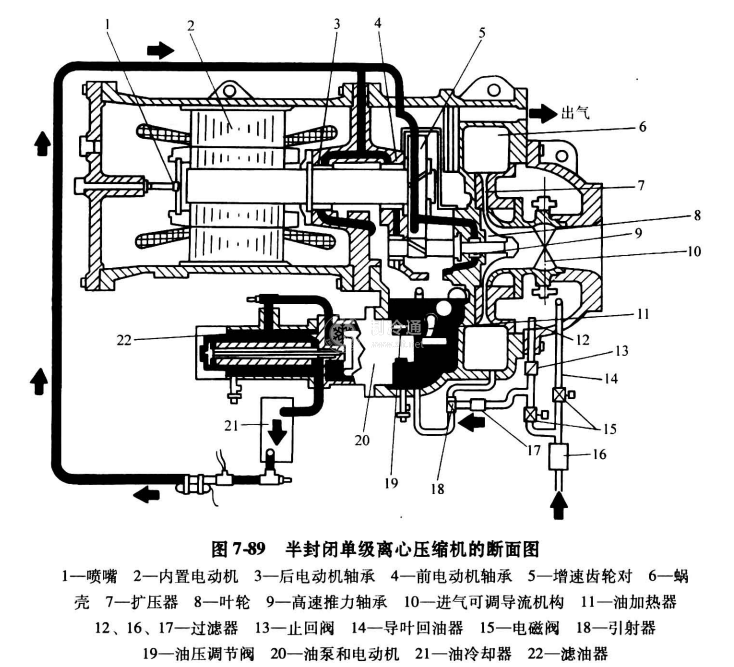 按結構分,離心壓縮機可分為開啟式、半封閉式和全封閉式。圖7-89為半封閉單級離心壓縮機的斷面圖,它使用的工質是新型環保制冷劑R134a。