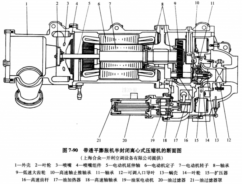近幾年來,開利公司開發了一種帶透平膨脹機的離心式壓縮機,旨在回收制冷系統中的膨脹功,圖7-90為這種壓縮機的斷面圖。據報道,用這種壓縮機組裝而成的冷水機組,COP值近7.0,實為節能產品。