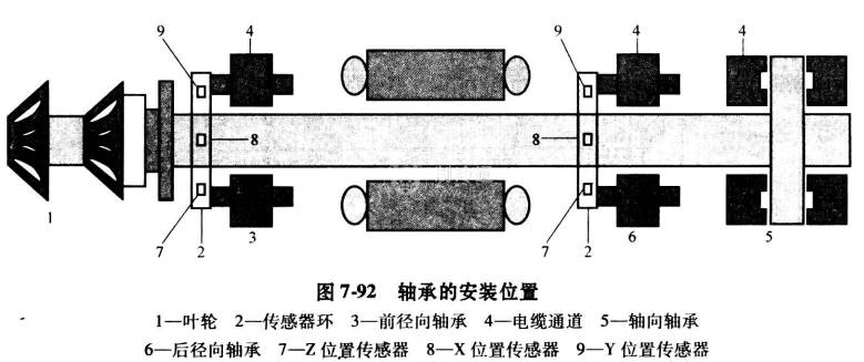 為實現全無油潤滑,該壓縮機采用兩個徑向和一個軸向推力電磁懸浮軸承,它的安裝位置見圖7-92。TT300的轉子軸(包括電動機轉子)和葉輪在旋轉時懸浮在磁墊上,實現了無油且在無摩擦狀態下工作。電磁軸承由水久磁鐵和電磁鐵組成。為保證轉子軸正常旋轉,在前后徑向軸承外各安裝三個位置傳感器(X, Y. Z),實時反饋轉子軸運行狀況并對軸承進行調控。當停機和故障停機時,由裝在軸承處的徑向石墨軸承支撐。