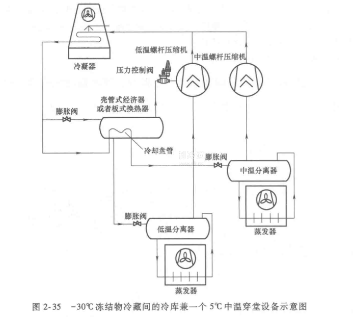 核心提示:在一個(gè)蒸發(fā)溫度-30℃凍結(jié)物冷藏間的冷庫(kù)同時(shí)還設(shè)置一個(gè)5℃中溫穿堂,這是目前國(guó)內(nèi)最常見(jiàn)的冷庫(kù)配置模式。按國(guó)內(nèi)目前常規(guī)的設(shè)計(jì)模式,基本上都是按圖2-35所示的制冷系統(tǒng)進(jìn)行設(shè)計(jì)。