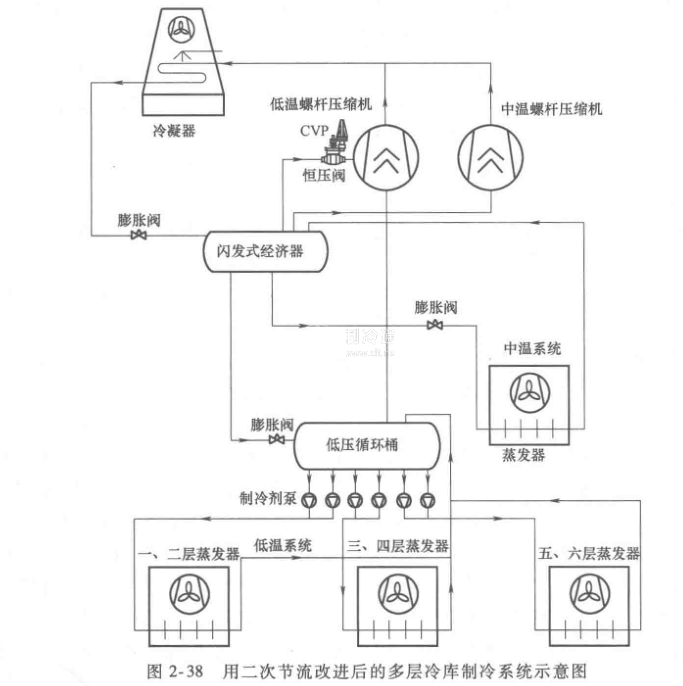 核心提示:對(duì)于高層冷庫(kù),如果這些冷間的溫度都相同,那么圖2-36所示的系統(tǒng)可以擴(kuò)展成為圖2-38所示的系統(tǒng)。在這種系統(tǒng)中,只需要一臺(tái)低壓循環(huán)桶,因?yàn)檎舭l(fā)溫度是一樣的。
