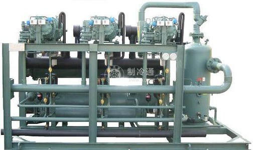 并聯(lián)壓縮機組早期是從國外引進(jìn)的。并聯(lián)壓縮機組,顧名思義,是由兩臺以上甚至更多的壓縮機并聯(lián)組成的。并聯(lián)壓縮機組還需要一塊控制面板及安裝在公共基礎(chǔ)框架上的貯液器等。一個并聯(lián)壓縮機組上有壓縮機公共排氣管和吸氣管。可以用一臺油分離器、氣液分離器、回氣換熱器同時為所有壓縮機和冷風(fēng)機的運行服務(wù)。