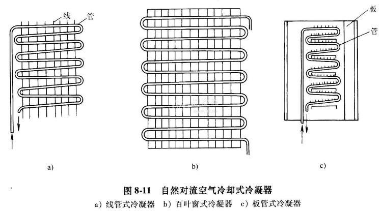 然對流空氣冷卻式冷凝器的結構如圖8-11所示。在自然對流空氣冷卻式冷凝器中,空氣受熱后產生自然對流,將冷凝器中熱從帶走。由于空氣流動速度很小,傳熱效果很旅,為此將金屬絲環繞在管外,形成線式或百葉窗式冷凝器;有的將傳熱管膠合在冰箱箱體壁面上,形成板管式冷凝器,以增強傳熱效果。這種冷凝器一般用于小型裝置,如冰箱、空調器等。