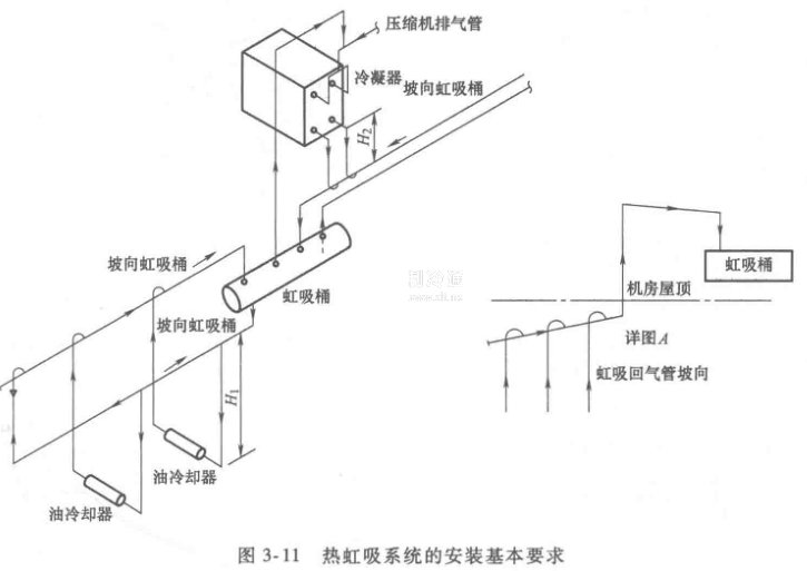 2)虹吸桶與油冷卻器的回氣總管坡向虹吸桶。因為回氣是氣液兩相的混合物,坡向虹吸桶使液體盡快流人虹吸桶而不會產生液堵。