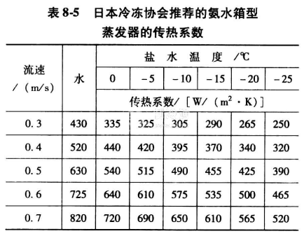 從試驗結果分析,直管式、單頭螺旋管式、雙頭螺旋管式氨蒸發器,在流速相同時,傳熱效果十分相近。日本冷凍協會推薦的氨水箱型蒸發器(包括直立管式、人字形等)的傳熱系數見表8-5。