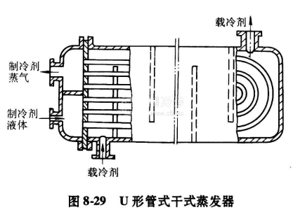 干式蒸發(fā)器的外形和結(jié)構(gòu),與滿液式臥式蒸發(fā)器基本相同。主要不同點(diǎn)在于干式蒸發(fā)器中,制冷劑在管內(nèi)蒸發(fā),制冷劑液體的充灌量很少,大約為管組內(nèi)容積的35%~40%,約為滿液式臥式殼管式蒸發(fā)器的1/2~1/3或更少,而且制冷劑在蒸發(fā)汽化過程中,不存在自由液面,所以稱為“干式蒸發(fā)器”。圖8-28所示為一種R22干式蒸發(fā)器的構(gòu)造。在干式蒸發(fā)器中,液體載冷劑在管外被冷卻。為了增加管外載冷劑的流速,在殼體內(nèi)橫跨管束裝設(shè)許多折流板,圖8-29所示為U形管式干式蒸發(fā)器,傳熱管安裝在同一塊管板上。傳熱管可先行安裝后再裝入殼體。制冷劑可始終在一根管子內(nèi)流動(dòng)和蒸發(fā),不會(huì)出現(xiàn)多流程時(shí)氣液分層現(xiàn)象。但由于每根傳熱管的彎曲半徑不同,制造時(shí)需采用不同的加工模具。