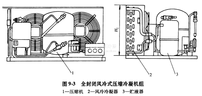 全封閉式壓縮冷凝機(jī)組具有高效、安靜、可靠性高等特點(diǎn),適合中高溫應(yīng)用,可采用R22, R134a,R404A, R507等多種制冷劑。操作時(shí)蒸發(fā)溫度最低可達(dá)到-40℃,用途廣泛,可適用于空調(diào)、熱泵、干燥機(jī)、制冰機(jī)、冷水機(jī)及冷庫制冷等。圖9-3為全封閉式風(fēng)冷式壓縮冷凝機(jī)組的外形圖。