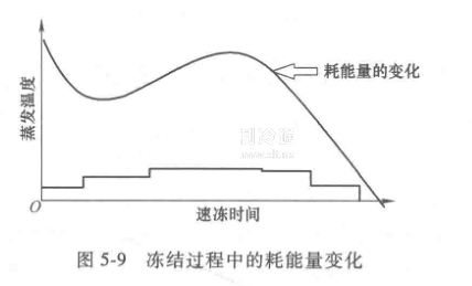如果壓縮機用于凍結食品,需要凍結的豬肉從26℃開始降溫。假定降溫的蒸發溫度是從-10℃開始計算,采用冷風機吹風凍結,當豬肉完成凍結時的中心溫度達到-18℃,這臺壓縮機運行對應的蒸發溫度可能是-38℃,從這臺壓縮機的選型軟件(采用中間補氣方式)可以知道,它的冷凝負荷在蒸發溫度-10℃時是444kW-38℃時是127.5kW最大和最小的冷凝負荷在127.5~444kW之間,耗能量變化曲線大致如圖5-9所示。