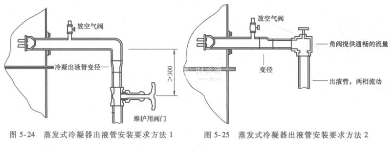 冷凝器出液管的連接要求,目的是減少出液管的整體阻力,以便于冷凝后的液體能順暢地流走,不讓這些液體占用有限的冷凝面積。推薦的連接方式有: