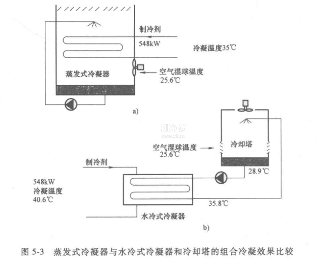 參考文獻(xiàn)曾經(jīng)把蒸發(fā)式冷凝器,與殼管式冷凝器和冷卻塔相結(jié)合的冷卻系統(tǒng)進(jìn)行對比。結(jié)果顯示用相同工況下蒸發(fā)式冷凝器實現(xiàn)冷凝溫度35℃,而水冷式冷凝器冷凝溫度是40.6℃,即采用蒸發(fā)式冷凝器冷凝溫度降低了5.6%,蒸發(fā)式冷凝器的性能優(yōu)越性在于避免中間介質(zhì)(冷卻塔水)傳熱過程。使用冷卻塔時出水的溫度是28.9℃,而進(jìn)水的溫度只能接近環(huán)境濕球溫度,即進(jìn)水溫度35. 8℃(圖5-3a與圖5-3b),蒸發(fā)式冷凝器的傳熱效果可以使冷凝溫度更接近空氣的濕球溫度。從資金成本來說,蒸發(fā)式冷凝器的成本可能小于水冷式冷凝器、冷卻塔的造價總和。