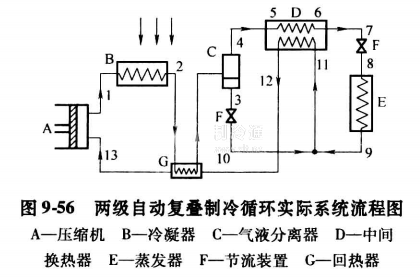 9-56表示兩級自動復疊制冷循環實際系統流程圖。其制冷系統工作過程如下:混合制冷劑經壓縮機壓縮并排入冷凝器,在冷凝器中進行變溫冷凝,其中高溫制冷劑冷凝為液體,而低溫制冷劑仍然保持為氣態。