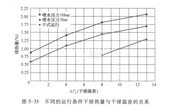 這種設(shè)備的另一個(gè)特點(diǎn)是:噴水壓力越高、干球的溫差越大,排熱效果越好。如圖5-35的比較,根據(jù)不同的運(yùn)行條件,2. 5~16bar的噴水壓力比較合適。