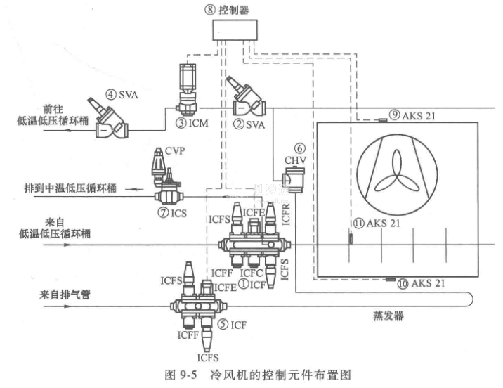 冷風機的控制回路(圖9-5)功能特點是:具有多個溫度控制點,這些溫度控制點除了控制庫房的溫度外(這個點是在庫房溫度達到設置溫度時關閉供液電磁閥),還用于控制融霜溫度終止值。在達到融霜溫度后,提前終止融霜,以減少能耗;如果還要細化,還可以設置融霜后冷風機風扇重新起動的溫度,這是因為在蒸發器融霜后,蒸發器的盤管翅片仍然有熱量,如果這時起動冷風機的風扇,這些熱量會加熱庫房的空氣溫度.導致庫房的空氣膨脹,若情況嚴重會把冷庫的門頂開,如果這道門鎖上,會把門鎖打爛,甚至能把冷庫的頂掀起,使冷庫的結構遭到破壞。