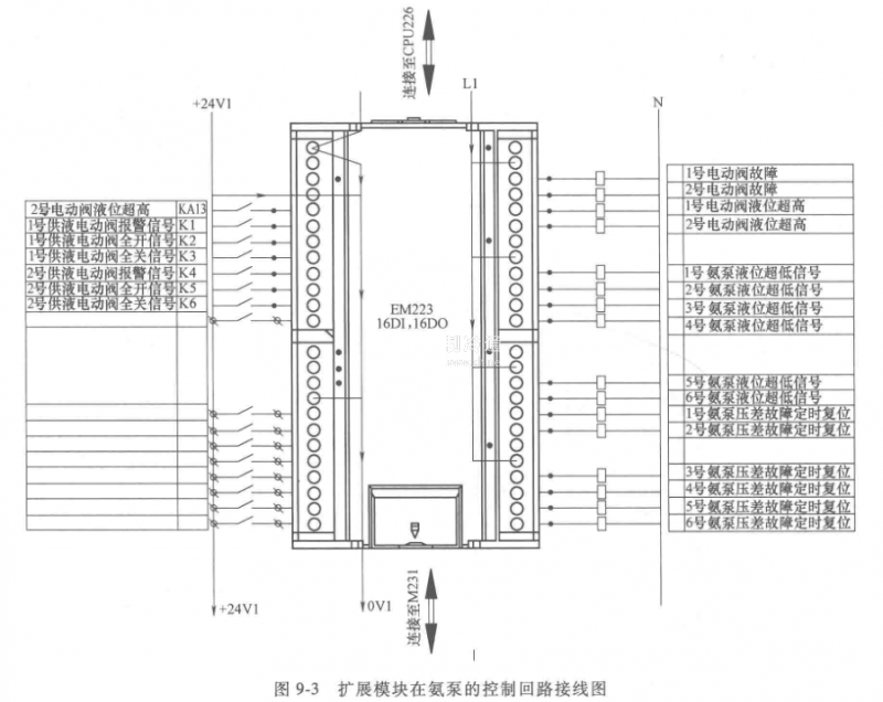 這個(gè)控制回路包括低壓循環(huán)桶的供液與液位控制(正常液位、超高液位、低液位等)、泵的壓差保護(hù)、泵的故障報(bào)替、泵的電流過(guò)載等(圖9-3)。這種控制的功能特點(diǎn)是:如果液位控制采用電子元件,那么報(bào)警液位就應(yīng)該采用機(jī)械式的控制元件。如圖9-4所示,液位控制是采用AKS 4100/4100U,而低液位報(bào)警和高液位報(bào)替則采用AKS 38機(jī)械式的控制元件,理由是萬(wàn)一電子元件出現(xiàn)故障,至少有機(jī)械式的控制元件作為第二重保障。