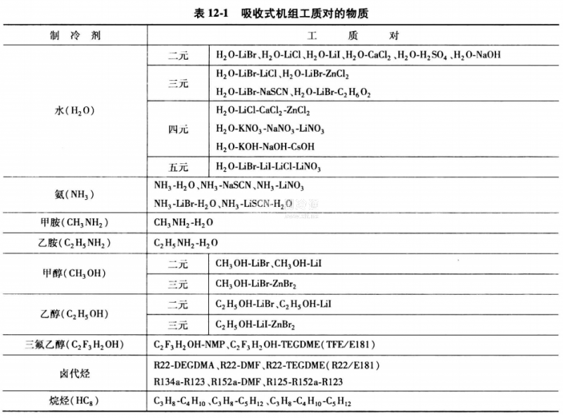 目前廣泛使用的只有水一溴化鋰溶液和氨一水溶液兩種工質對。表12-1列出部分可用作吸收式機組工質對的物質。其中,可在多效循環中應用的工質對是近年來的一個研究熱點。
