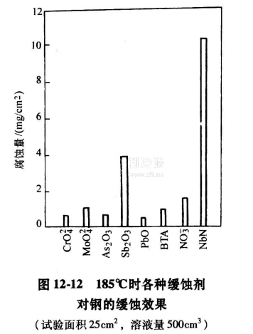 從溴化鋰溶液對金屬材料腐蝕的機理可知,防止腐蝕最根本的辦法是制冷機組保持真空,盡可能不讓氧氣侵入。此外,在溶液中添加各種緩蝕劑,也可以有效地抑制溴化鋰溶液對金屬的腐蝕。緩蝕劑在金屬表面通過化學(xué)反應(yīng),形成了一層細(xì)密的保護膜,使金屬表面不受或少受氧的侵襲,所以能有效地抑制腐蝕的發(fā)生。常見的緩蝕劑主要有鉻酸鹽、鉬酸鹽、硝酸鹽,以及銻、鉛、砷的氧化物。另外,一些有機物,如BTA苯并三唑) , TTA (甲苯三唑 )等,在溴化鋰溶液中也有良好的緩蝕效果。在堿度調(diào)整后的質(zhì)量分?jǐn)?shù)為60%的溴化鋰溶液中,添加各種緩蝕劑后,鋼材在165℃和185℃的腐蝕情況如圖12-11和圖12-12所示。由圖可知,鉻酸鉀、鉬酸鋰、硝酸鋰、三氧化二銻和BTA等在185℃時,都具有良好的緩蝕效果,適用于在二效機組中使用。對于三效機組,溶液的溫度高達230℃左右,緩蝕劑的選擇是一個重要的研究課題。