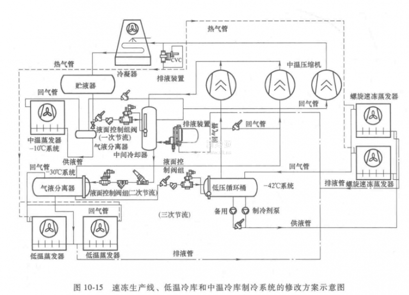 該項目是一條融合速凍生產線(-42℃系統)、低溫冷庫(放置速凍產品,-30℃系統)和中溫冷庫(放置速凍產品的原材料,如水果、蔬菜等,-10℃系統)以及中溫穿堂(-5℃系統)的一個混合的氨制冷系統(圖10-14),與國內許多的食品加工廠的制冷系統相似。這是原始的設計方案,與國內比較,不同的只是采用二次節流。其中速凍系統為桶泵供液,其余的是重力供液。