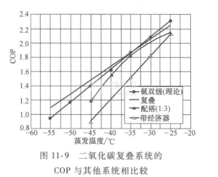 根據(jù)相關資料介紹以及二氧化碳的熱力性能可知,二氧化碳應用在制冷方面,其蒸發(fā)溫度在-44~-35℃的范圍COP值會超過氨制冷劑(圖11-9)。但是我國的冷庫,很少會使用這么低的蒸發(fā)溫度。目前國內冷鏈物流冷庫的使用主體是民營企業(yè),他們對于冷庫的能耗是非常在意的。這些冷庫的經營利潤不高,大部分的冷庫運行都采用避峰用電,目的是減少高峰用電的費用。能耗的增大會進一步加重他們的經營負擔,可能會影響他們使用這種系統(tǒng)的積極性。