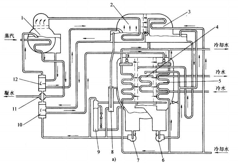 雙效蒸汽型溴化鋰吸收式冷水機組的串聯循環流程結構比較簡單,運行操作比較方便。但是,發生器的放汽范圍比較小,溶液的循環倍率比較大,因此,機組的熱力系數比較小。通常將溶液先進入高壓發生器,后進入低壓發生器的循環流程,稱為串聯流程;將溶液先進入低壓發生器,后進入高壓發生器的循環流程,稱為倒串聯流程。