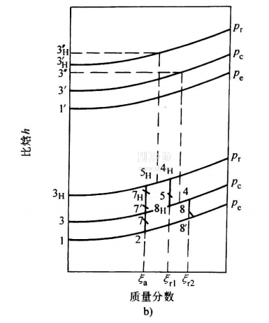 濃溶液在吸收器中的吸收過程。在圖b上的過程線為8-8'-2。吸收器中的壓力為蒸發壓力Pe,流入吸收器的濃溶液所處的狀態點8為過熱態。因此,濃溶液進入吸收器后,有一部分冷劑蒸汽閃發出來,其質量分數略有提高,閃發終了的狀態點8’為平衡態。隨后,噴淋到吸收器傳熱管簇上的濃溶液,吸收來自蒸發器的冷劑蒸汽,同時向管內的冷卻水排放熱量;在吸收器的出口處,溶液稀釋到狀態點2,成為稀溶液。因此,過程線8-8’為閃發過程,8'-2為吸收過程。