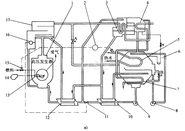 圖13-7為熱水和冷水采用同一回路的直燃型溴化鋰吸收式冷熱水權以及其制熱循環流程圖上的表示。在制冷工況,轉換閥A、B關閉,機組按稀溶液在低溫溶液換熱器之后分流的雙效溴化鋰吸收式機組的并聯循環流程工作。在采暖工況,轉換閥A, B開通,冷劑蒸汽經轉換閥和旁通管路,自高服發生器流入蒸發器并在其中冷凝;冷劑水經轉換閥和旁通管路,自蒸發器流入吸收器并在其中稀釋濃溶液;熱水在蒸發器傳熱針內被加熱,并經冷水回路向機組外供熱。