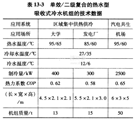 圖13-11表示一種單效/二級復合的熱水型溴化鋰吸收式冷水機組的循環(huán)流程。它由蒸發(fā)器、吸收器、冷凝器和單效發(fā)生器構成的單效循環(huán),以及蒸發(fā)器、吸收器、高壓吸收器、冷凝器、低壓發(fā)生器和高壓發(fā)生器構成的二級循環(huán)復合而成。驅動熱源回路將單效發(fā)生器、高壓發(fā)生器和低壓發(fā)生器串聯(lián)起來,由區(qū)域集中供熱管網(wǎng)向機組提供95℃或85℃的熱水。用三通閥改變輸送到單效和二級循環(huán)流程的熱水量的配比,從而實現(xiàn)機組的負荷調節(jié)。冷卻水回路把吸收器、冷凝器和高壓吸收器串聯(lián)起來,冷卻水的溫度為27℃/35℃。通過蒸發(fā)器和冷水回路提供12℃/6℃的冷水。機組的熱力系數(shù)接近0.6。這種機組的技術數(shù)據(jù)見表13-3。