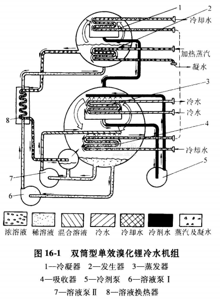 圖16-1為一種雙筒型單效溴化鋰冷水機組。在上面的筒體中,冷凝器1和發生器2為上下布置;在下面的筒體中,蒸發器3和吸收器4也為上下布置。發生器采用沉浸式結構,蒸發器和吸收器采用噴淋式結構。機組采用三只屏蔽泵。吸收器中溶液的噴淋方式,采用濃溶液和稀溶液混合噴淋。冷卻水采用串聯型式。