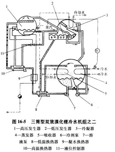 圖16-4為一種并聯溶液流程的三筒型雙效溴化鋰冷水機組。在左上方的筒體內單獨布置高壓發生器1;右上方的筒體內,上下布置低壓發生器2和冷凝器3;在下方的筒體內,上下布置蒸發器4和吸收器5。高壓發生器和低壓發生器采用沉浸式結構,蒸發器和吸收器采用噴淋式結構。溶液按并聯流程流動,即從吸收器5流出的稀溶液,由溶液泵7分別經低溫和高溫溶液換熱器或凝水換熱器回熱后,同時送入高、低壓發生器。稀溶液在高、低壓發生器加熱濃縮后,成為濃溶液,進入吸收器管簇上噴淋,吸收來自蒸發器的冷劑蒸汽。機組采用兩臺屏蔽泵:冷劑泵6使冷劑水在蒸發器中循環噴淋;溶液泵7將稀溶液送入高、低壓發生器,還用于引射濃溶液和稀溶液混合后成為中間溶液,在吸收器內循環噴淋。冷卻水按串聯回路流動,即先進吸收器,后進入冷凝器。