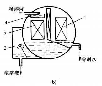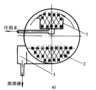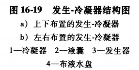 冷凝器與發生器的壓力相同,通常布置在一個筒體內,如圖16-19所示。冷凝器的結構也是管殼式結構。傳熱管內通冷卻水,制冷劑蒸汽在傳熱管外被冷凝和冷卻。冷劑水由管簇下面的水盤收集,經過節流進入蒸發器。