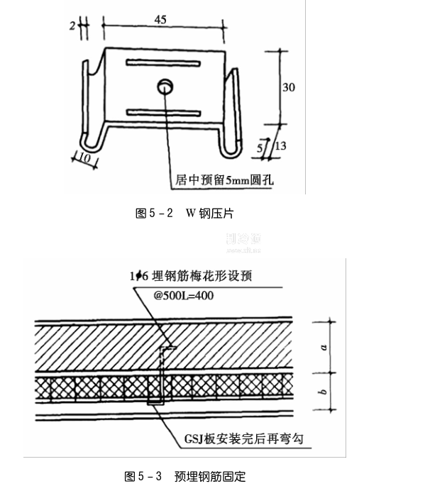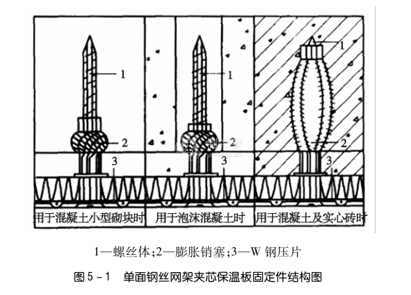 第一,安裝單面鋼絲網架夾芯保溫板用的固定件有膨脹銷塞與螺絲釘和W壓片配套使用,詳見圖5-1、圖5-2。也可采用預埋的防銹鋼筋,詳見圖5-3。還可采用膨脹螺絲,詳見圖18。固定件的數量為每平方米6~9個,且呈梅花形布置。