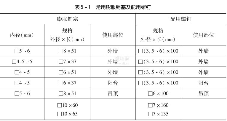 膨脹螺絲的直徑為5~6毫米,錨固深度≥6倍膨脹螺絲的直徑。空心磚或空心混凝土砌塊墻,宜采用德國托克斯萬能銷寨,螺釘長度等于保溫板厚度與銷塞長度之和另加3~5毫米螺釘直徑為4~5毫米。膨脹銷寨與配用螺釘見表5-1,也可單獨采用在墻內預埋鋼筋來固定該夾芯保溫板(不再用W壓片),鋼筋直徑為6毫米,預埋筋間距500姍,且呈梅花形設置,錨固長度應大于180毫米。預埋鋼筋伸出主體外墻部分要進行有效的防腐處理。