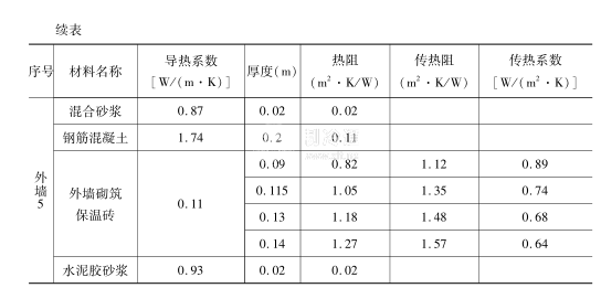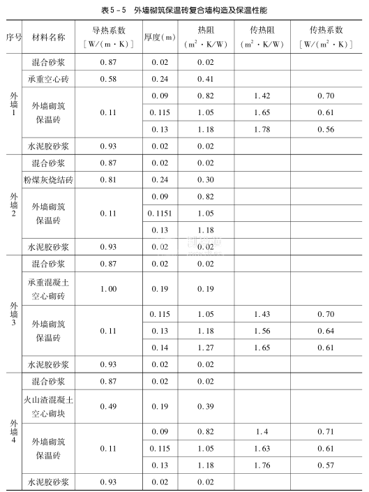 外墻砌筑保溫磚外保溫復(fù)合墻的構(gòu)造及熱阻、傳熱阻和傳熱系數(shù)見表5-5。
